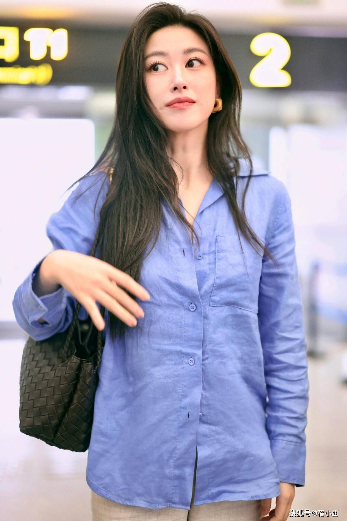 朱珠的穿衣风格散发着优雅与舒适。她穿着一件宽松的蓝色衬衫,柔软的面料和随性的版型让整体造型显得既大气又不失轻松感。衬衫上的微小褶皱,仿佛是时间留下的痕迹,增加了一丝慵懒的味道。下身搭配了一条米白色的阔腿裤,宽松的裤型不仅拉长了腿部线条,还营造了一种无拘无束的休闲感。