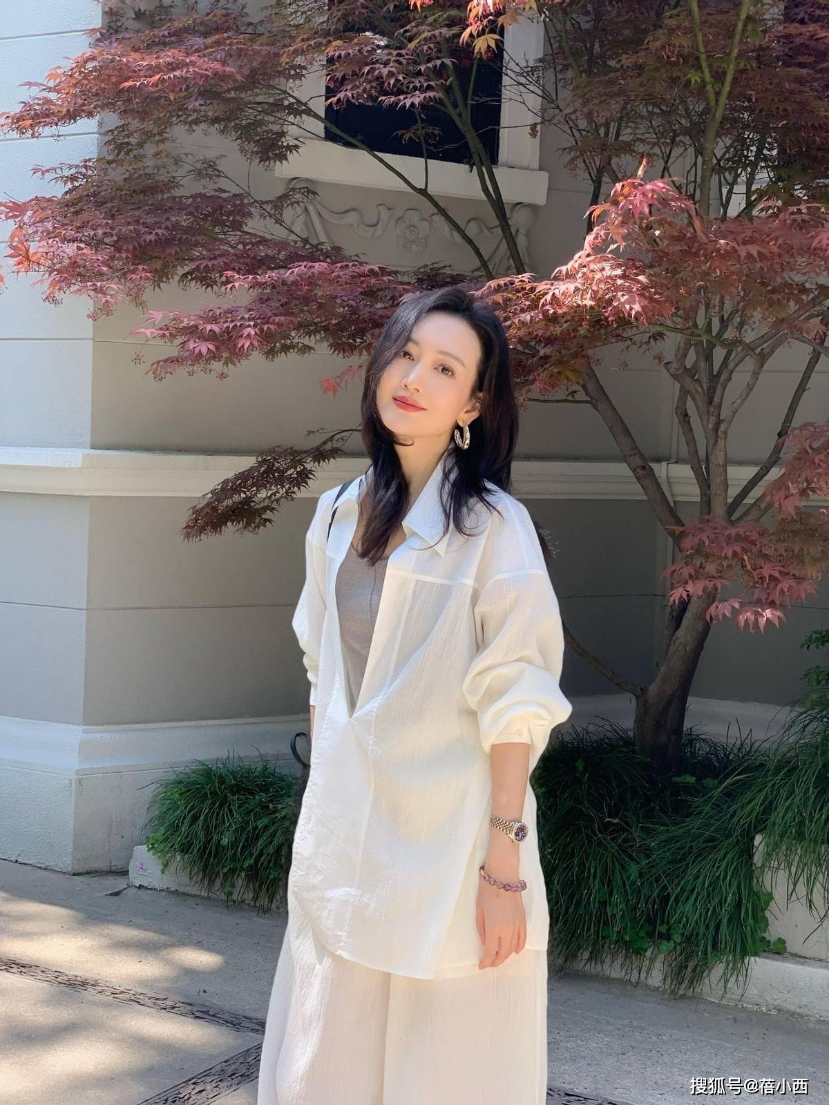 她将衬衫的领口轻松敞开,露出内搭的细节,既随性又大方。整个造型并未选择过于紧身的衣物,反而彰显出一种大气、优雅的气质。搭配简单的手表、手链等配饰,不仅让造型更具精致感,也让她在41岁的年纪依然保持着非凡的美丽。